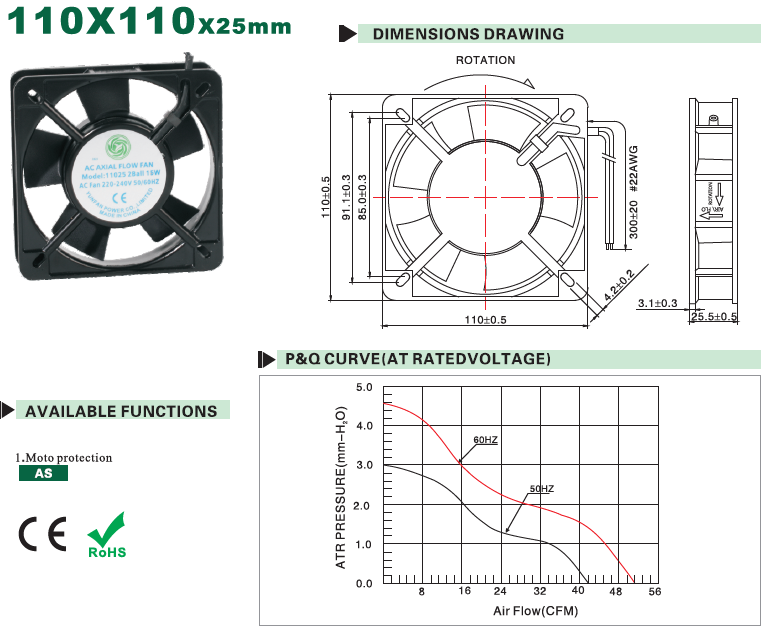 La ventola CC è alimentata tramite tensione CC, sempre 5 V, 12 V, 24 V, 48 V, 60 V e 72 V. La ventola CA è alimentata tramite tensione CA, sempre 110 V, 220 V e 380 V.