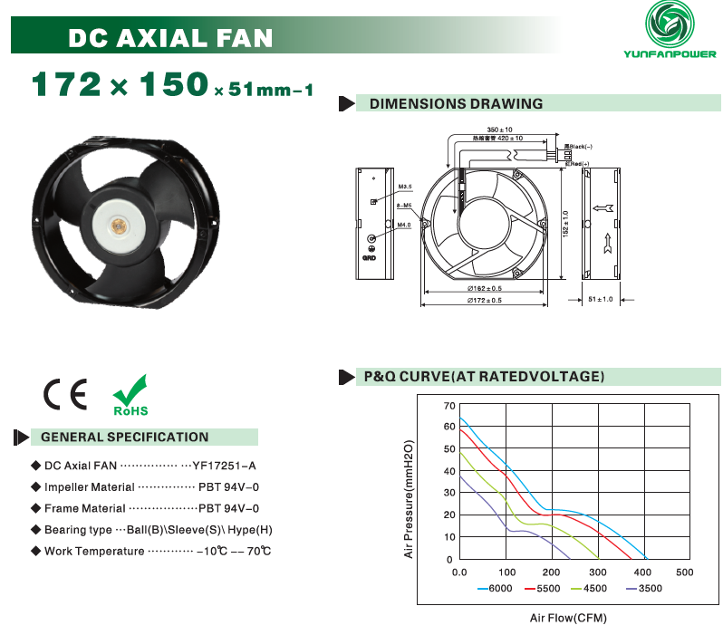 La ventola CC è alimentata tramite tensione CC, sempre 5 V, 12 V, 24 V, 48 V, 60 V e 72 V. La ventola CA è alimentata tramite tensione CA, sempre 110 V, 220 V e 380 V.