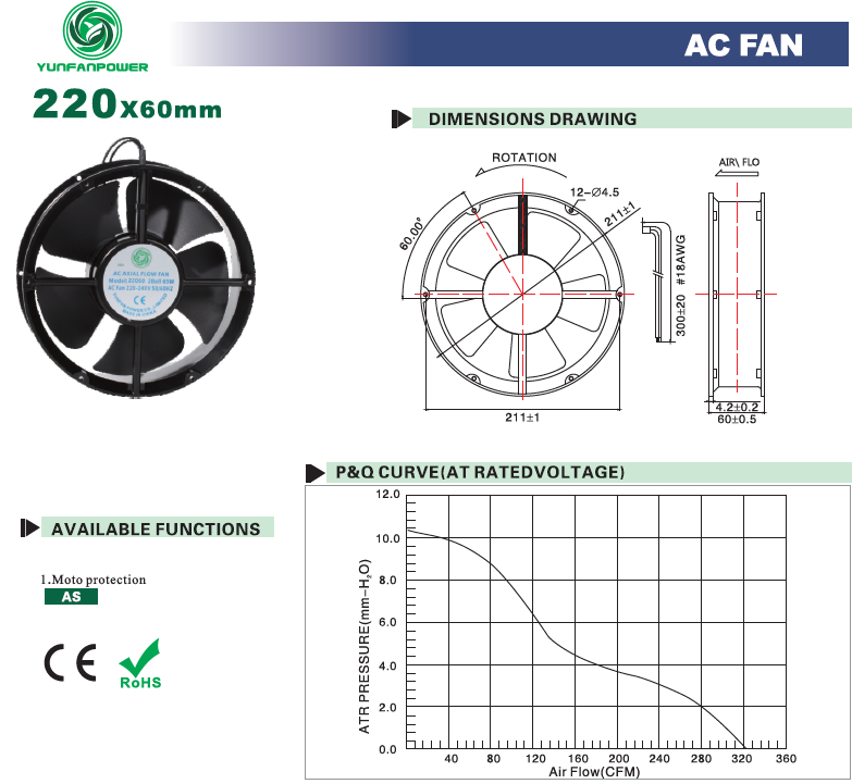 La ventola CC è alimentata tramite tensione CC, sempre 5 V, 12 V, 24 V, 48 V, 60 V e 72 V. La ventola CA è alimentata tramite tensione CA, sempre 110 V, 220 V e 380 V.