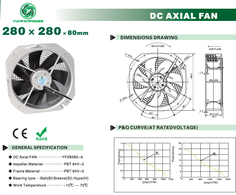La ventola CC è alimentata tramite tensione CC, sempre 5 V, 12 V, 24 V, 48 V, 60 V e 72 V. La ventola CA è alimentata tramite tensione CA, sempre 110 V, 220 V e 380 V.