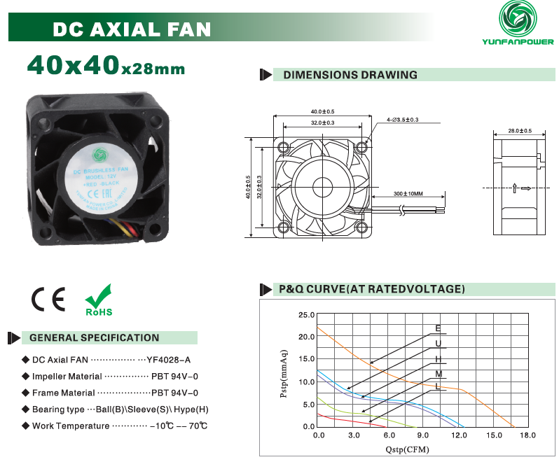 | Modello YFD4028B12H | 6 | 0,25 | 3 | 9500 | 0,34 | 11.48 | 40.5 | ||